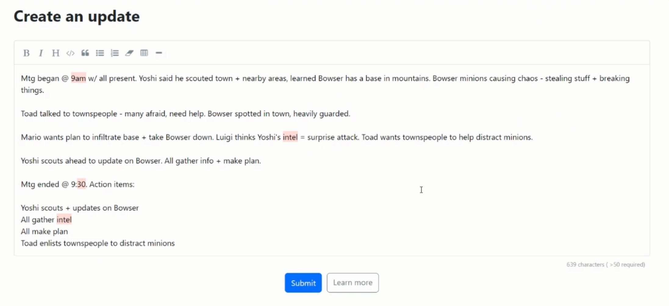 When building SolidlyAI, my initial feasibility risk was “Will I be able to create AI-generated meeting summaries that are good.” The quickest experiment to measure this risk was to build a simple prototype. This simple prototype took a couple of days to make. The prototype itself was a text editor where people could upload their sloppy post-meeting notes and, in response, receive clean AI-generated meeting summaries. I was amazed at how well it worked and saw steady, returning usage. All of this indicated that the feasibility risk was minimal, and I should move on to address the value risk.