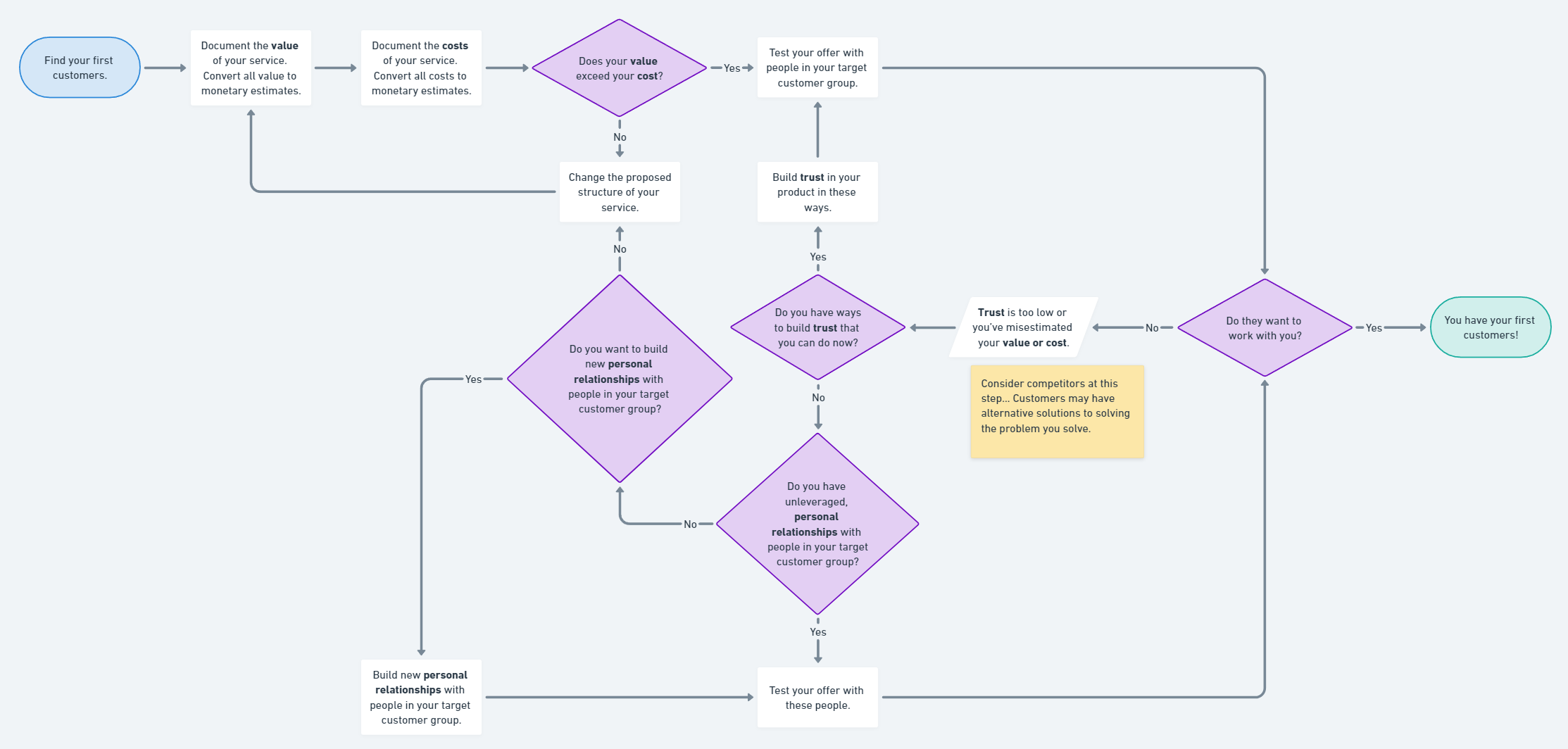 If you struggle to find your first customers when starting your company, run through the flow chart above. The step-by-step process will help you structure your product to drive more value at lower costs. If people don’t trust your value exceeds your cost, build trust. If you don’t have ways to build trust, find ways to leverage existing personal relationships.